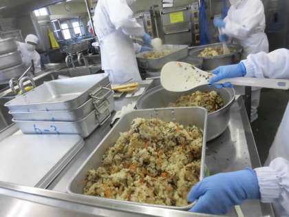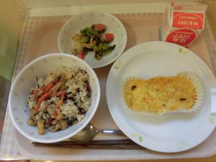☆今日の給食は擬製豆腐です。豆腐料理の1つで、豆腐を細かく崩したものに卵や野菜を混ぜて焼いた料理のことを言います。精進料理とも言われていてヘルシーな料理の1品となっています。今日も給食室でカップ1つ1つに入れてオーブンで焼きました。