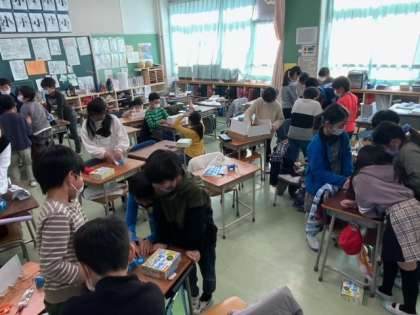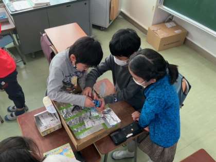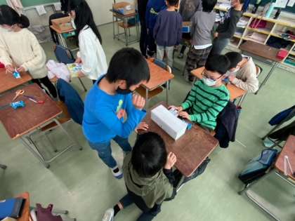 理科で作った豆電球と電池の回路を使ったおもちゃで遊ぶ活動をしています。