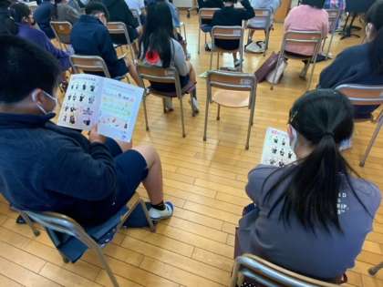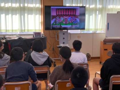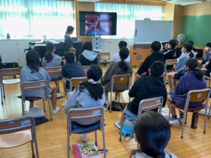 音楽で越天楽を鑑賞しています。オーケストラと違って打楽器が前に並んでいることに問いをもった子どももいます。