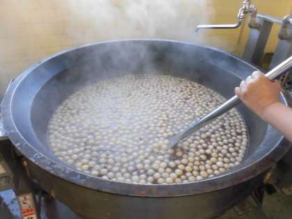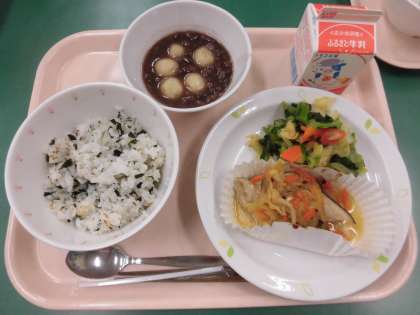 ☆今日から3学期の給食がスタートしました。今日は鏡開き給食で、給食室では、大釜に小豆と砂糖を入れて時間をかけて柔らかく煮て、白玉しるこを作りました。甘さもひかえめで、子ども達にも人気でした。