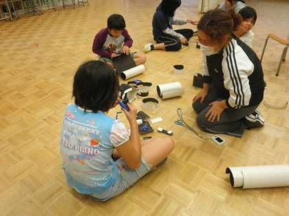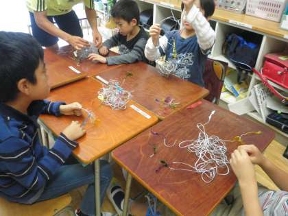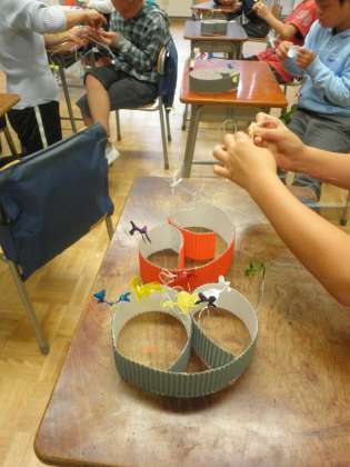 つくし学級では、図工の授業をしていました。高学年は、波型の紙を巻いていろいろな形を作っていました。