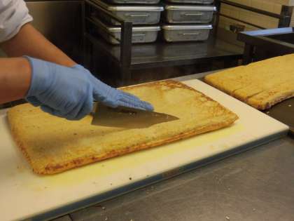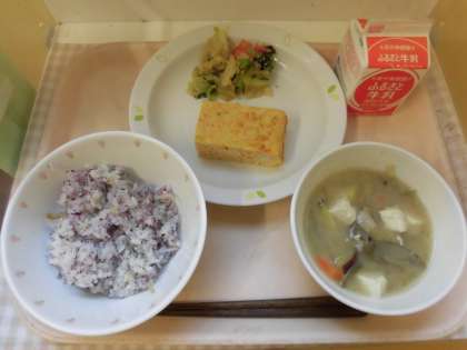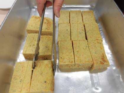 ☆今日の献立は「たまご焼き」です。鶏ひき肉や野菜をみじん切りにした、にんじん、たまねぎ、たけのこ、しいたけを大釜で炒め卵液を入れ混ぜました。そして、バットに卵液を流し入れてオーブンで焼き、包丁でカットしました。