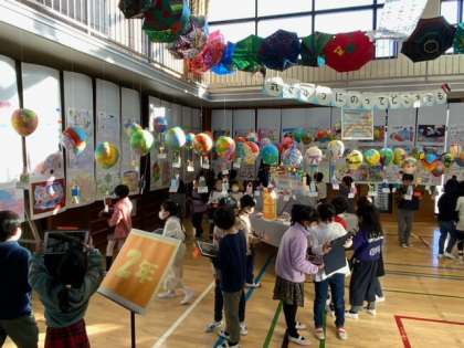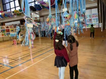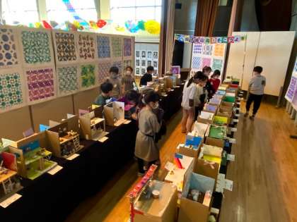 展覧会が始まりました。テーマが「すてき発見!烏山アートミュージアム」です。1年生が作品を鑑賞しています。「すごい」「かわいい」「かっこいい」という声があちらこちらから聞こえてきます。興奮気味で鑑賞しています。