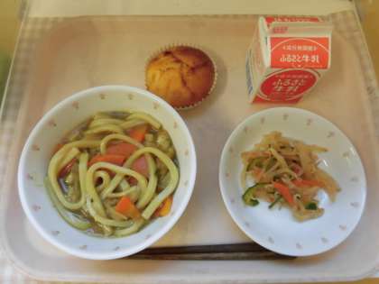 ☆今日のデザートは、ヨーグルトポムポムです。給食室でたくさんのりんごを切りました。ケーキ生地の中にはヨーグルトも入り、その中にりんごを入れてオーブンでケーキを焼きました。