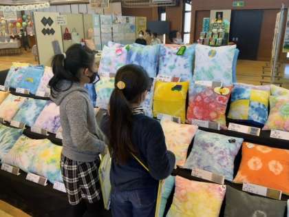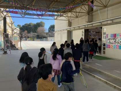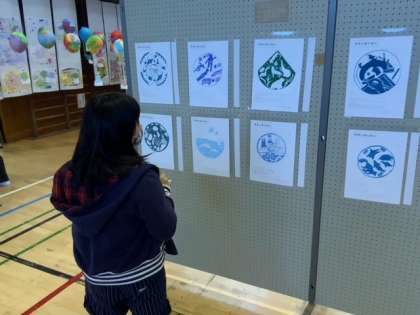 4年生の鑑賞の時間です。気になった作品についてメモをしながら観ています。上祖師谷中学校の生徒の作品も展示されています。