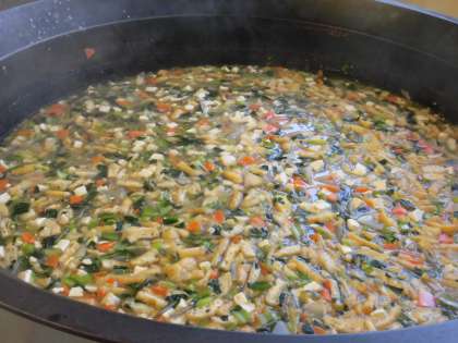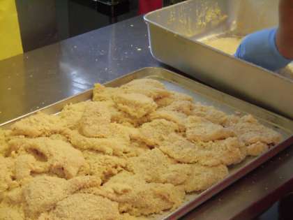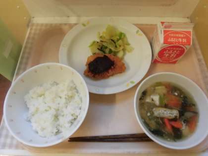 ☆今日の給食は「みそチキンカツ」です。カラっと揚げた、チキンカツにみそダレをかけた料理です。名古屋名物の1つで、一般にはソースをかけるチキンカツに対して、八丁みそを使うのが特徴です。八丁みそは愛知県岡崎市八帖町で作られたので、この名がついたそうです。給食室でもたくさんのチキンカツを掦げました。
