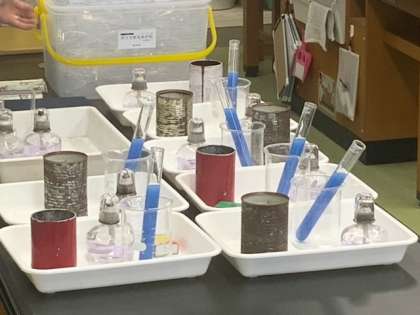 理科「ものの温まり方」で、サーモインクの入った試験管をアルコールランプで熱して、色の変化を観察していきます。