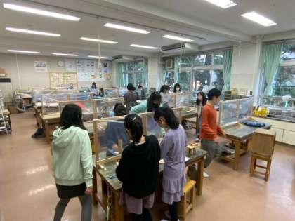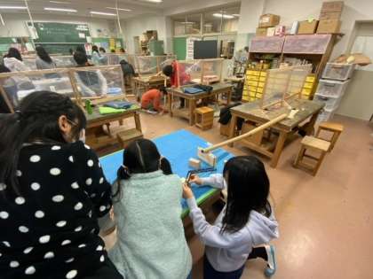 図工で道具の形や置く物の角度などを調整しながらピタゴラスイッチを作っていきます。とても楽しく取り組んでいます。完成したらタブレット端末で作品を撮影していきます。