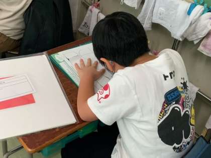 カッターナイフを使う練習をしています。手を切らないに、とても真剣に取り組めています。少し硬めの紙に印刷されている線に合わせて切っていきます。