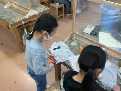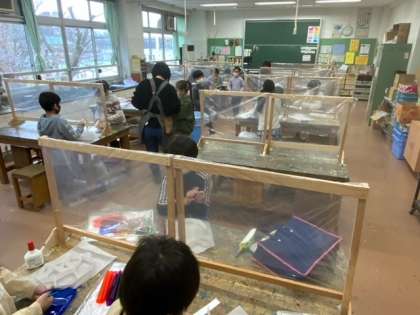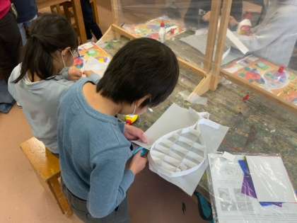 図工です。紙で思い思いの形を作り、セロファンを中に入れ、透かして見るとステンドグラスの様にきれいな色になります。