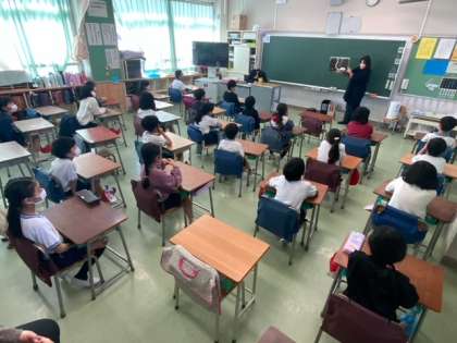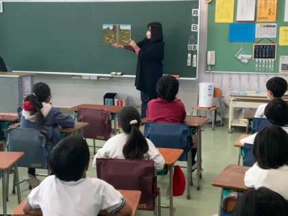 おはなし泉の皆様による読み聞かせです。子どもたちは、おはなしの世界に引き込まれていました。