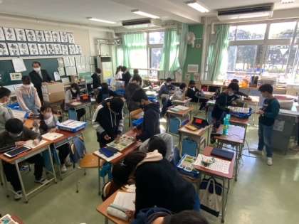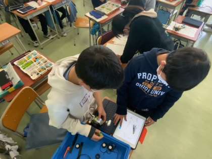 総合的な学習の時間でプログラミングの学習です。ブロックで動くおもちゃを作り、プログラムをして操作していきます。
