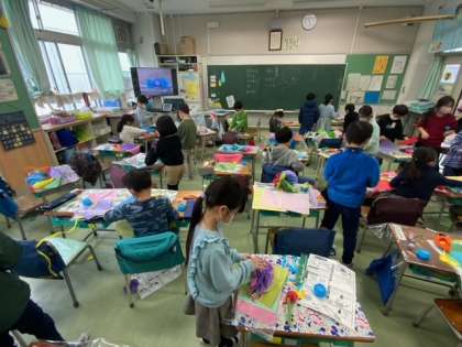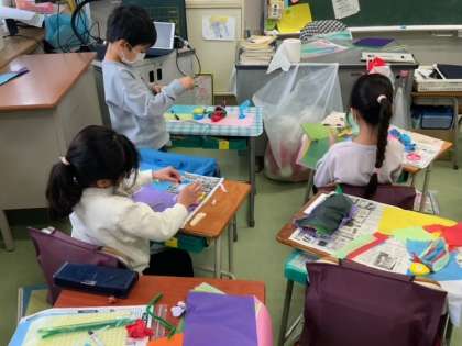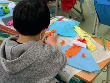 図工で、お花紙を丸めて、ちぎって、重ねて、巻いて、ねじって、編んで、結んで、包んでを使って、思い思いに作品をつくっています。