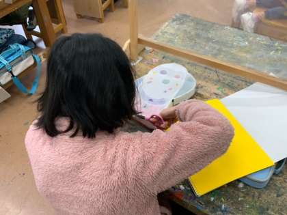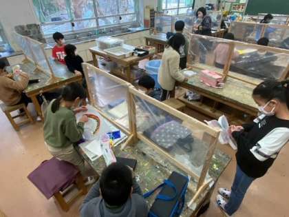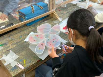図工で光のサンドイッチをつくっています。セロファンを入れて透かした色を確かめながらつくっている姿も見られました。