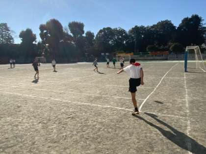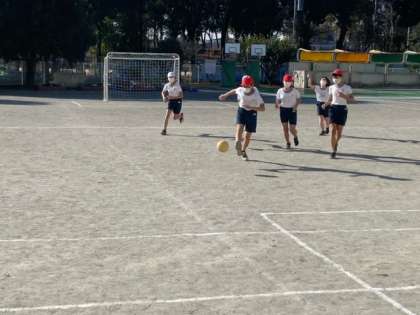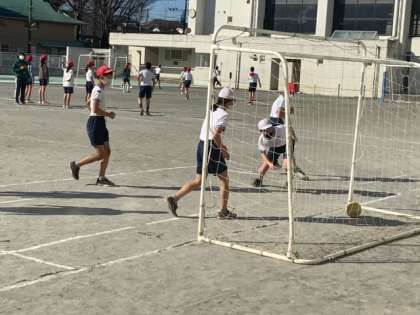 体育でゴール型のボール運動で、ゴールサッカーに取り組ます。チームの人数を少なくして誰もが参加しやすいルールになっています。キーパーがいないので、点が入るチャンスが増えます。