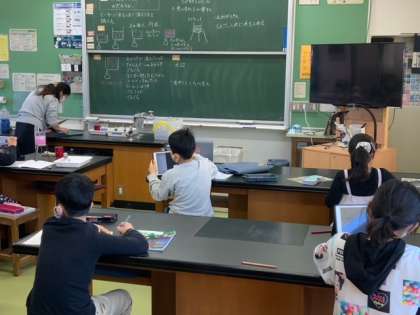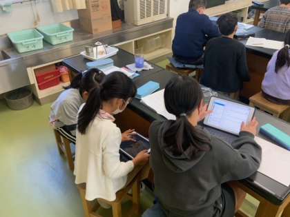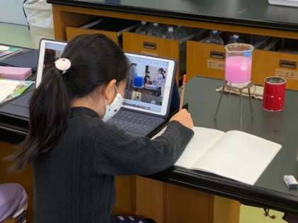 理科の「物の温まり方」で水はどのようにして温まるのかを実験を通して確かめていきます。ビーカーにサーモインクを入れてアルコールランプで火を当てる位置を変えて録画もして観察しました。その考察の交流をしています。