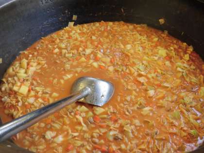 ☆今日の献立は、ボルシチです。ボルシチはロシアの家庭料理の1つとも言われていて、肉やベーコン、じゃがいも、にんじん、きゃべつ、トマトなどを鍋で長い時間コトコト煮込んだ具だくさんのスープです。今日も給食室の大釜でたくさん作りました。