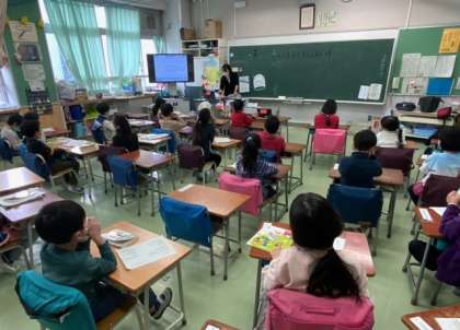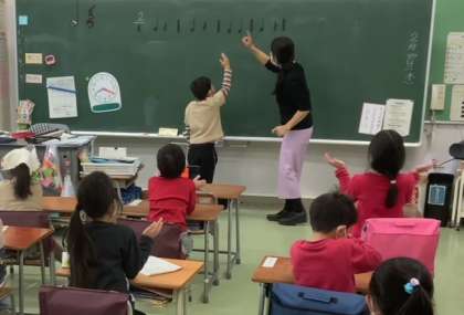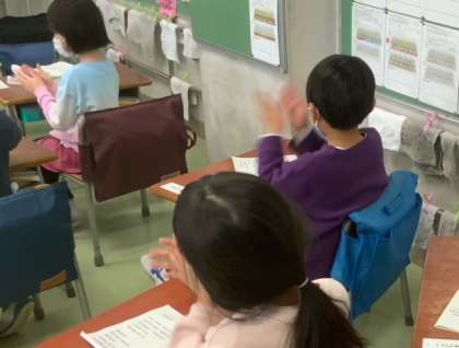 音楽で楽しい曲の「かじやのポルカ」に合わせて、手でリズム打ちをしています。