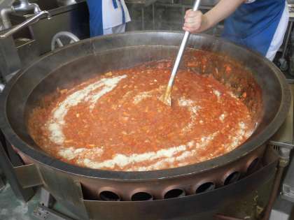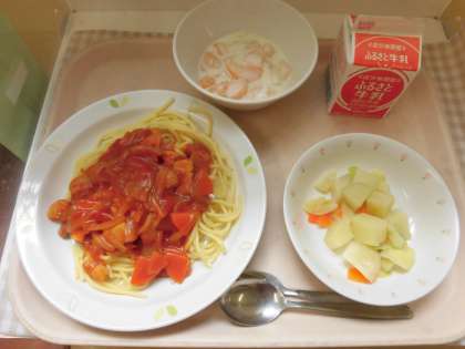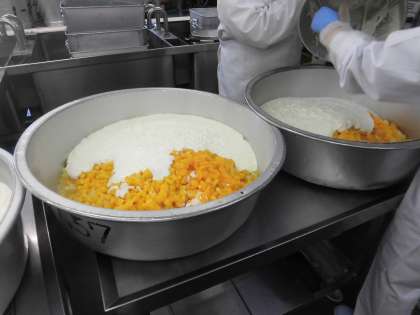 ☆今日は子どもたちの大好きな「フルーツヨーグルト」です。モモ缶 みかん缶 パイン缶 りんご缶と4種類の果物とヨーグルトを大きなタライで合わせて、フルーツヨーグルトの完成です。