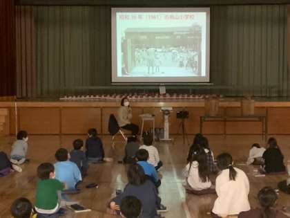 郷土資料館の方をゲストティーチャーにお招きして、烏山小学校付近の今と昔を貴重な写真を見ながら学んでいます。