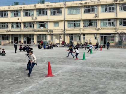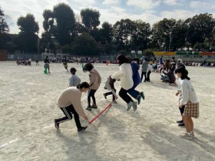 3年生と6年生は、台風の目対決です。3年生は運動会でたくさん練習しただけあって速いです。6年生は初めての競技で四苦八苦しています。