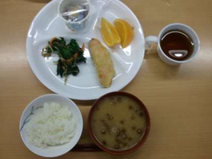 朝食の写真をアップするのを忘れました。メニューは、ごはん、なめこ汁、しゃけ、ほうれん草でした。みんな、よく食べていました。