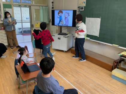 道徳の「はしのうえのおおかみ」で相手も自分もいい気持ちになるにはどうすればいいか考えていきます。