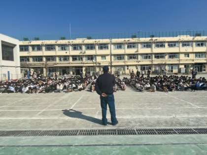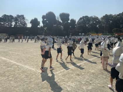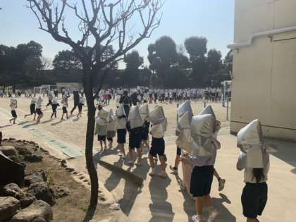 今回は、家庭科室から出火したことを想定しての避難訓練です。真剣に取り組むことができています。この後、4年生は消火器を使った訓練も体験します。