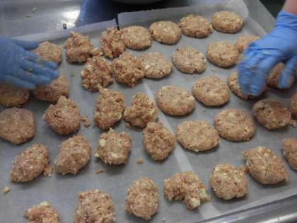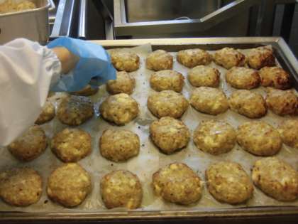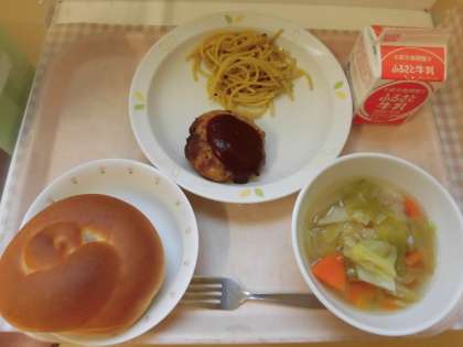 ☆今日は子ども達の好きな「ハンバーグ」です。調理員さん達が1つ1つハンバーグを丸めて作りオーブンで焼きました。約650個を作り大変な作業でした。そして、スパゲティーもカレー味でみんな喜んで食べていました。
