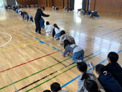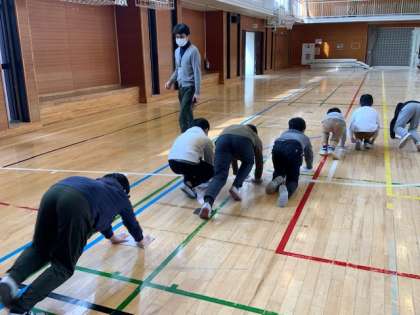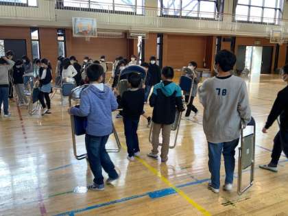 5年生が在校生の最上級生として、卒業式会場の準備をしています。全員での体育館の床ふいたり、イスを出したり、ひな壇を設置したりしました。気持ちよく働いています。