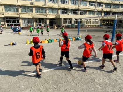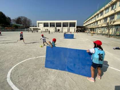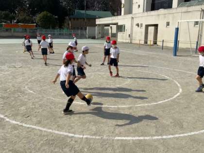 体育でボールを蹴るゲームに取り組んでいます。カラフルな段ボールをボールを蹴って押し出すゲームや、サークルの中から外へ蹴り出すゲームや、ゴールも動かして守ることができるサッカー型のゲームなど、ボールを蹴ることに親しんでいます。