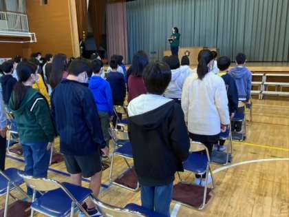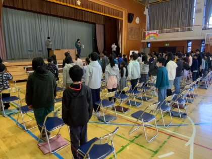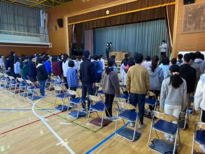 体育館に6年生全員が集まり、卒業式の門出の言葉の練習をしています。とても真剣に取り組めています。