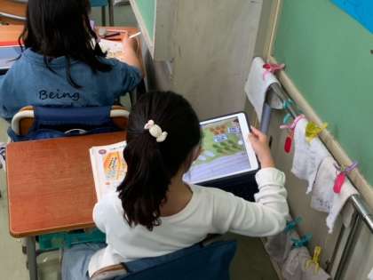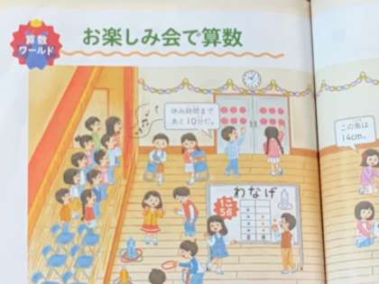 算数で、教科書のお楽しみ会の様子を見て、そこから一人一人が算数の問題づくりをしていきます。