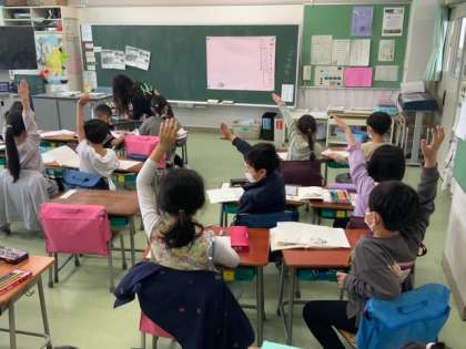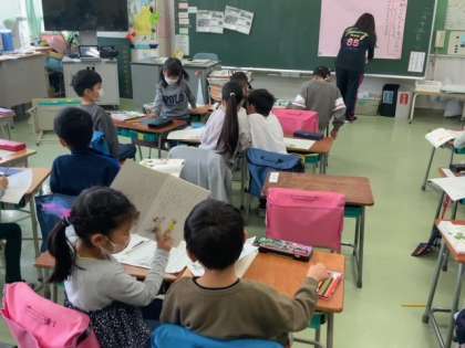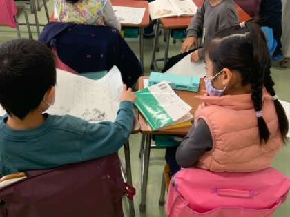 国語の「ずうっと、ずっと、大すきだよ」を読んで、バスケットをあげたのはどうしてなのかをそれぞれが考えて、隣のお友達と考えを交流しています。
