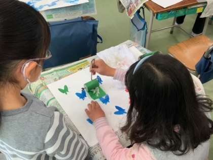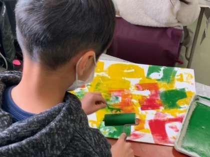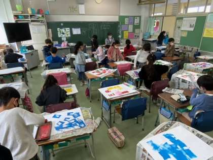 図工でローラー版画に取り組みます。透明な薄くて柔らかいプラスチックに型を切り抜いて、ローラーで紙に写し取っていきます。