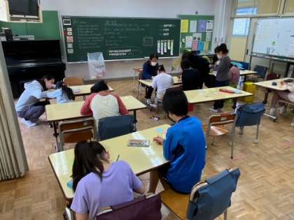6年生が卒業式練習で抜けていますので、1年生から5年生で6年生の卒業おめでとうを祝うパーティーの準備をしています。メッセージカードを書いています。