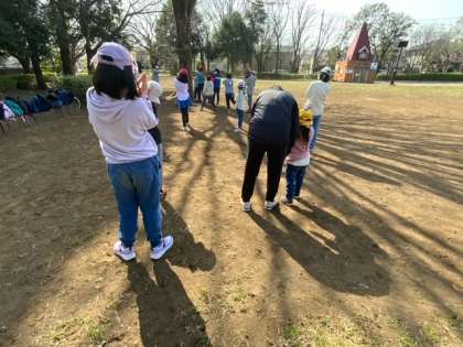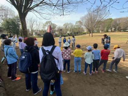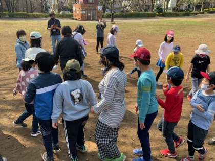 祖師谷公園で、6年生が考えた「だるまさんが○○した」と「かごめかごめ」で遊びます。「だるまさんが歯磨きした。」「だるまさんが空を見上げた。」「だるまさんがお昼寝した。」などなど。とても盛り上がっています。