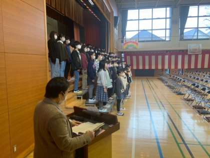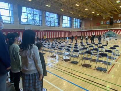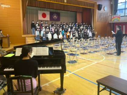 今日は、本番と同じように副校長先生の司会で練習を進めていきます。呼びかけの練習では、5年生も加わりました。「旅立ちの日に」6年生の歌声がとても素敵です。