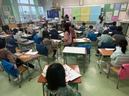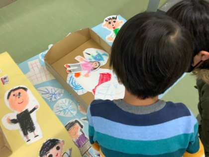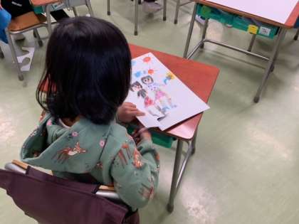 1年生が来年の1年生のために、掲示用の作品をつくっています。