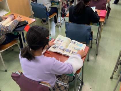 教科「日本語」で今年度学んできたことを教科書をめくりながら振り返っています。