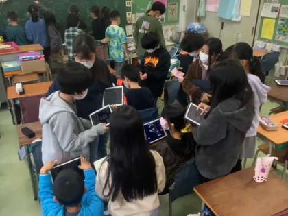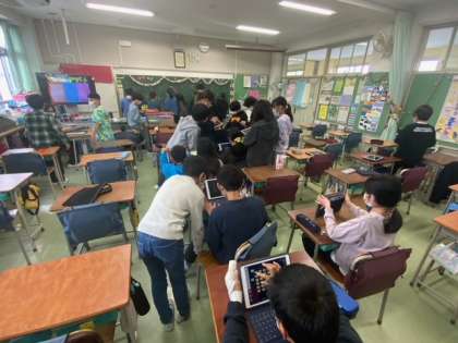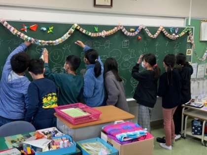 お楽しみ会を今日の5,6時間目に予定しています。4時間目を使って飾り付けや出し物の準備をしています。