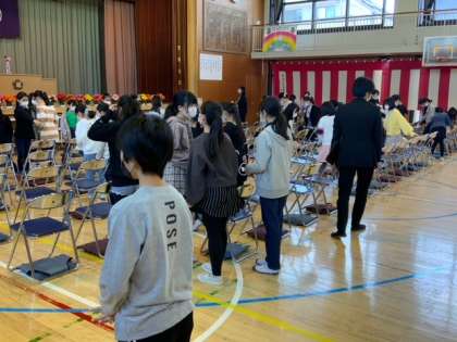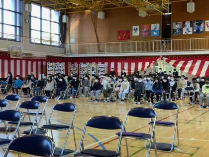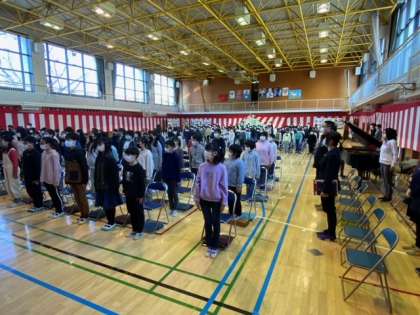 5年生も加わっての卒業式予行練習を行いました。実際には、感染症対策のため出席はできません。5年生はこれまで卒業式を裏から支えてきました。5年生は予行練習を通じて、6年生の門出の言葉の5年生に向けてのメッセージをしっかりと受け取めました。5年生は、予行練習後、会場を再び整えています。