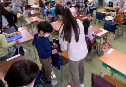 6年生が優しく1年生のサポートをしています。1年生も落ち着いて準備が進められています。