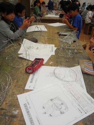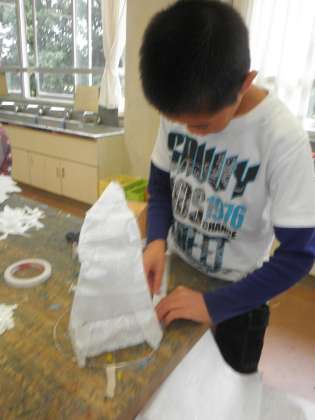 展覧会が近づいてきました。5年生は図工で、ランプシェードを作っています。針金を丸めたり、折ったりしながら形を作って、それに紙を張っています。みんな真剣な作業です。