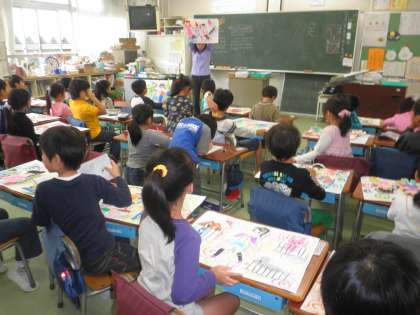 1年生は絵を描いていますが、平面ではなく、少し立体のようです。先生の話を真剣に聞いて取り組んでいます。