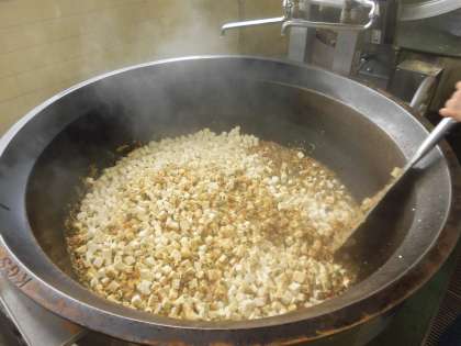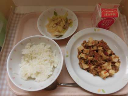 ☆今日から1学期の給食がスタートしました。クラスも変わったので、みんなが食べやすい献立にしています。たくさんの麻婆豆腐も給食室の大釜で作りました。