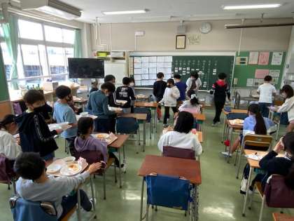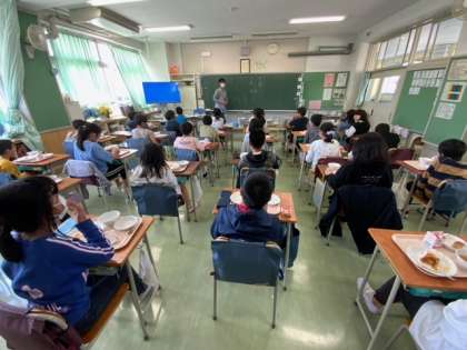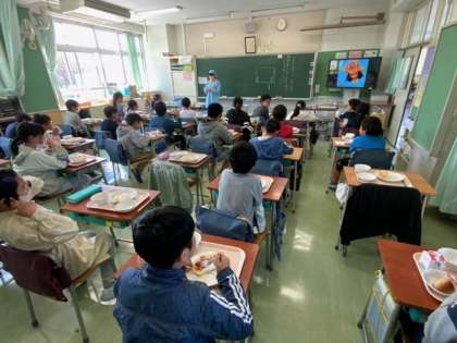 5年生はすでに食べ終えているクラスもありました。食べているクラスは、動画やクラッシック音楽を視聴しながら食べていました。