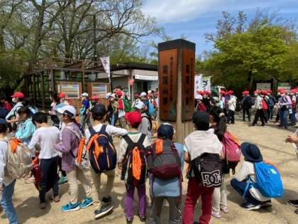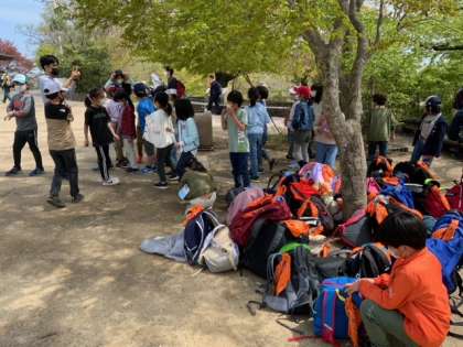 ?山頂に到着しました。よくがんばって登りました。最後の階段でかなりバテました。他の学校もきていますがかなり空いています。山頂で集合写真を撮っています。