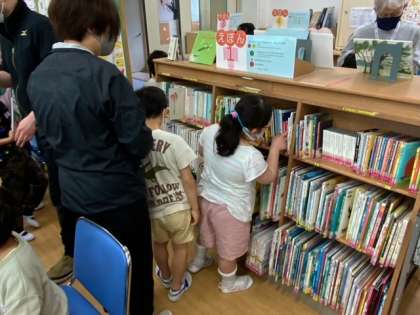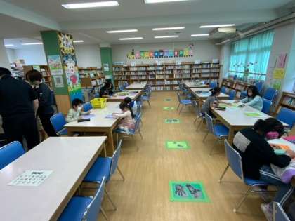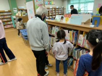 国語の図書の時間です。図書館で本を選んだり、読んだりしています。