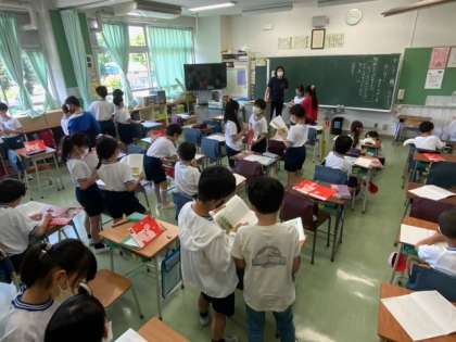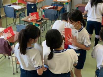 国語「白いぼうし」のおかっぱの女の子は「ちょう」だったのかどうか自分の考えとその理由を交流しています。